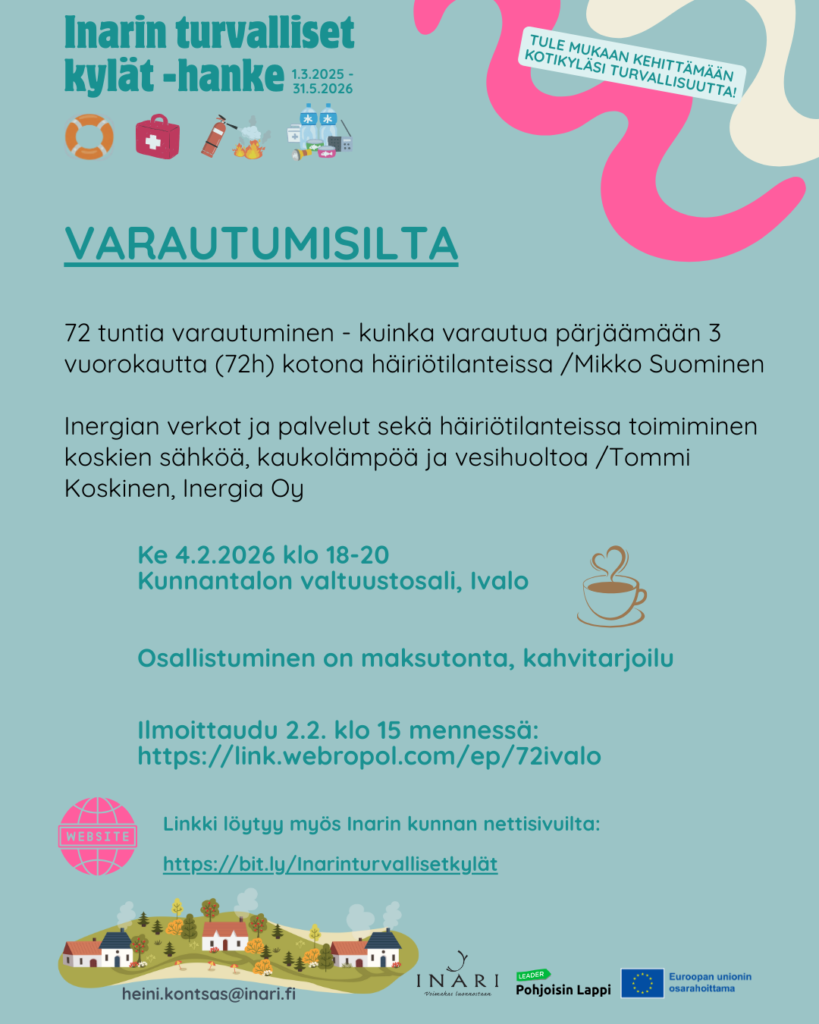 Inarin turvalliset kylät -hanke järjestää varautumisillan, jossa neuvotaan, miten voit varautua pärjäämään 72 tuntia kestävään häiriötilanteeseen kotona.